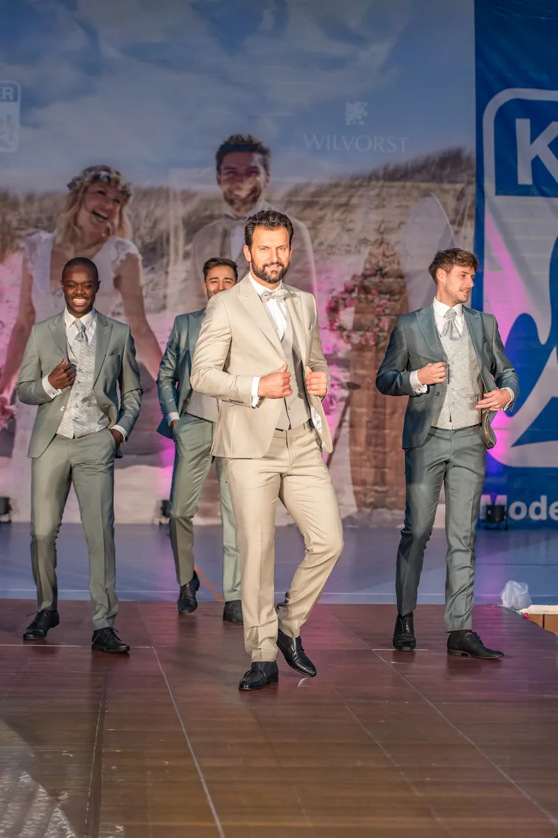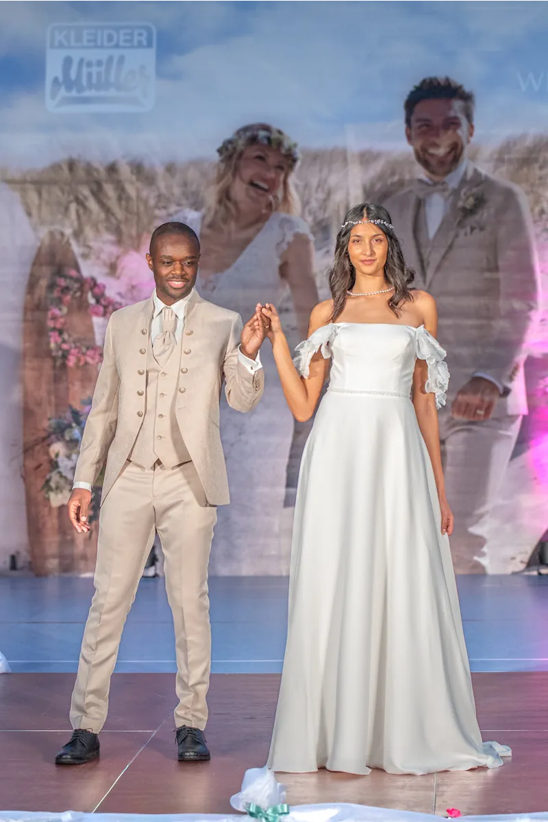 Besonderes Augenmerk galt wie jedes Jahr der großen Modenschau. Das Team von Kleider-Müller stellte dafür erneut eine feine Auswahl aus über 1000 Modellen zusammen. Die Show begann mit festlicher Mode für Gäste, Abendkleider und moderne Anzüge in harmonischen Farbnuancen von klassischem Blau bis zu Mut zu Grün, Bordeaux oder Aubergine. Auch die jüngsten Models zeigten sich in charmanten Outfits und sorgten für viele strahlende Gesichter im Publikum.